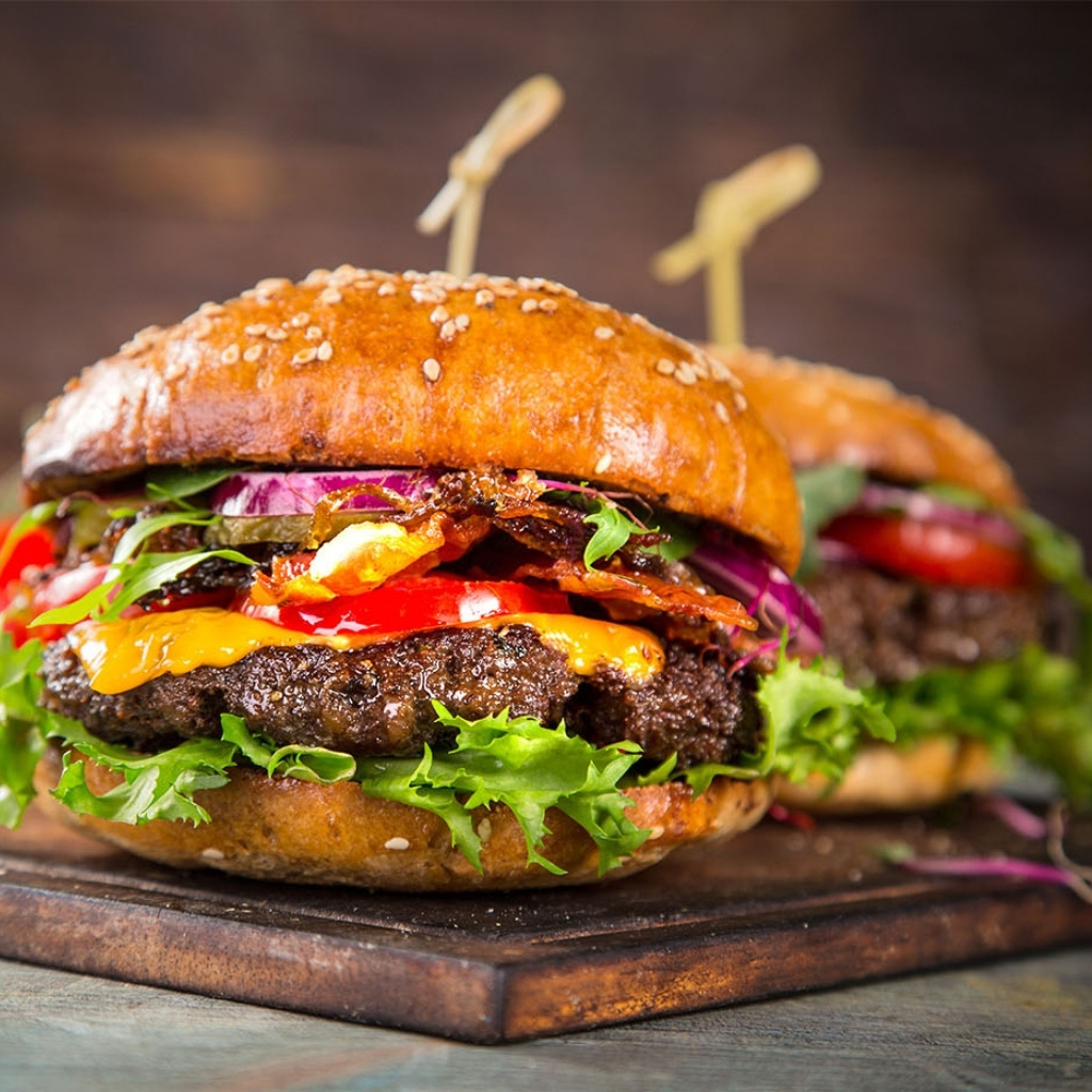 (hovädzie mäso, tatarská omáčka, syr, opečená slaninka, šalát, paradajka, cibuľa, sladkokyslá uhorka, omáčka podľa výberu) 220 gr.